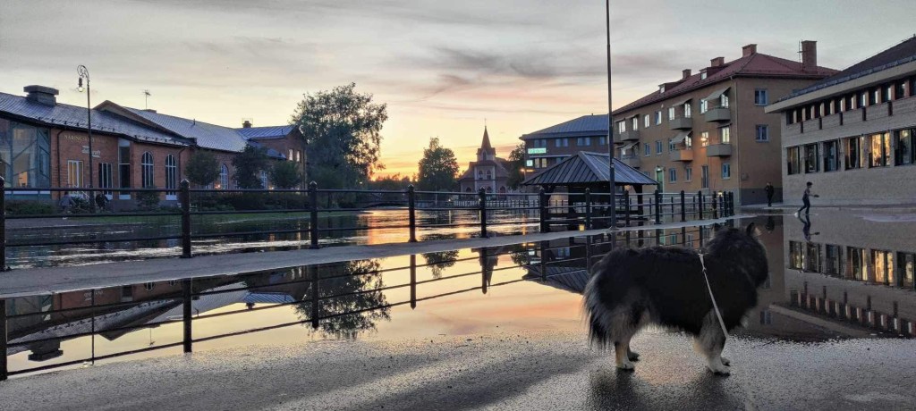 I går kväll gick mannen, en av döttrarna, Vera the dog och jag på vatteninspektionsrunda. Det var mäktigt och lite skrämmande. Hur påtagliga behöver tecknen på klimatkrisen bli innan vi alla ändrar vår livsstil? Kommer vi någonsin att göra det frivilligt? Vilka privilegierade grupper i historien har tidigare frivilligt gett upp sina privilegier? Jag kan inte komma på något exempel, även om det förstås finns enstaka individer som är beredda att göra det. Jag antar att vår nya älv snart kommer att återgå till att bli en stillsam å, om några veckor kanske eller så. Hursomhelst känns det som ytterligare en varning från naturen att vi människor borde skärpa oss big time innan det är för sent.